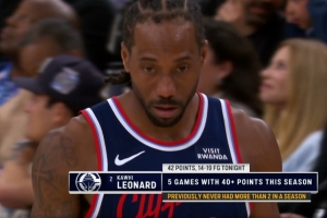 (此前,伦纳德最多单赛季仅拿到2次40+)