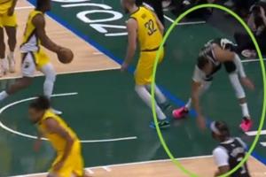 崴脚+膝盖过度伸展!字母哥扣篮落地失衡 捂着左膝!