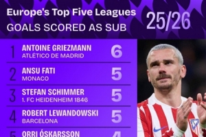 本赛季五大联赛替补登场球员进球数排行:格列兹曼以6球居首
