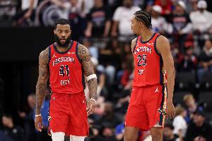 本场比赛,鹈鹕首发五人组多点开花,都得分上双,合砍84分:墨菲27分5板2助1断,萨迪克·贝20分6板6助1断,锡安15分5板2助3断,米西11分11板4助1帽,赫伯特·琼斯11分3板2助2断。