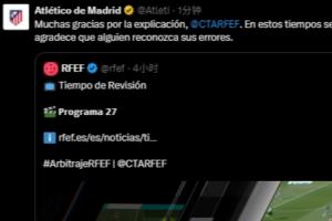 马竞官方账号转发了这一评议视频,并表示:“非常感谢您的解释。@西班牙裁委会 在如今这个时代,能够承认错误的人是值得称赞的。”
