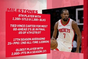 KD本季里程碑:历史最老单季2000分先生 生涯17次单季25+仅次老詹