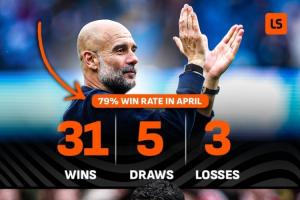据Livescore统计,四月是瓜迪奥拉执教球队在英超表现最好的月份,胜率高达79%,而四月却是阿尔特塔执教阿森纳表现最差的月份,胜率仅42%。