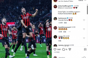 菲尔克鲁格社媒:精彩的战斗+不可思议的支持,米兰是红黑色的!