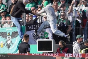 在昨晚进行的第25轮德乙联赛,普鲁士明斯特主场1-2负于柏林赫塔。上半场补时阶段,主队在禁区内疑似犯规,主裁判来到场边观看VAR视频回放。此时一名普鲁士明斯特球迷蒙面翻越护栏闯进球场,并拔掉了VAR显示器的电源插头,以此干扰主裁判的执法。